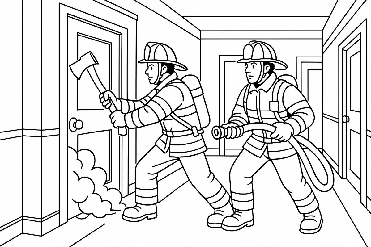 И тут важно: в отличие от множества «детских» раскрасок с героями мультфильмов, здесь остаётся настоящая взрослая драматургия. Не просто улыбающийся персонаж, а человек в моменте действия. Кто-то поднимает ребёнка, кто-то бежит по лестнице, кто-то держит рацию, отдавая распоряжения. И всё это доступно для раскрашивания — в чистых, чётких линиях, но с глубиной настоящей сцены.